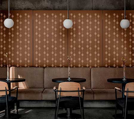 La chapa perforada es también muy utilizada para interiores, tanto a nivel estético y decorativo como para mejorar el rendimiento acústico de los ambientes. Pueden revestirse áreas en su totalidad, ajustando la modulación al espacio, o colocarse como paneles independientes añadiendo un toque contemporáneo y atractivo.