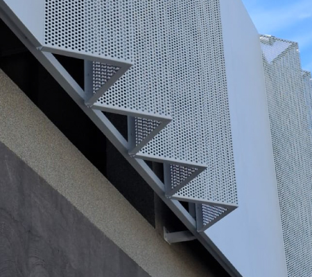 Los parasoles metálicos lisos o perforados ofrecen control solar, eficiencia energética y diseño diferencial. Personalizamos perforaciones y acabados para adaptarlos a la estética y funcionalidad requerida en cada proyecto.