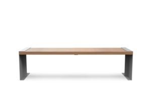 Un banco minimalista, versátil y resistente, diseñado para diferentes formas de uso en el espacio urbano.