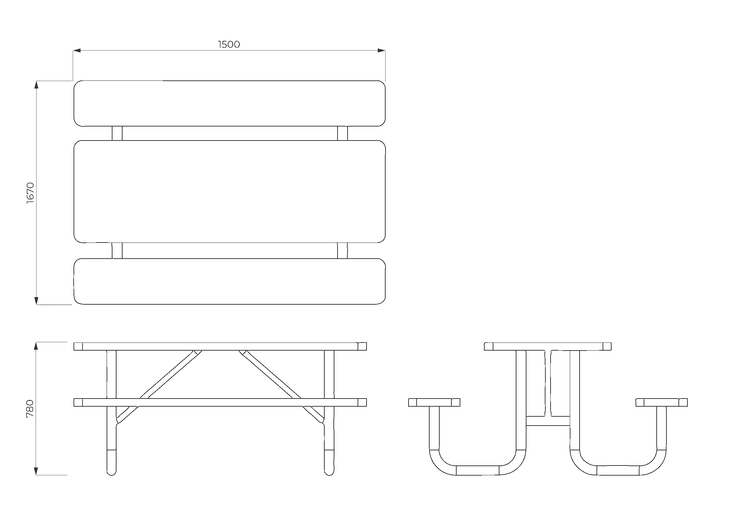 Una mesa sólida y funcional, diseñada para acompañar dinámicas colectivas y actividades cotidianas, integrándose con naturalidad al paisaje urbano y educativo.